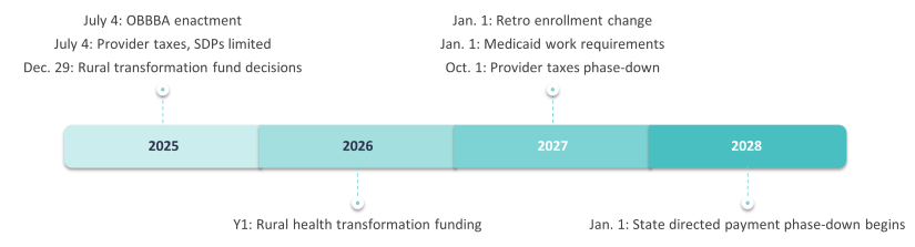 - Watch for key date shifts, including frozen and then reduced provider taxes, new limits on state‑directed payments, and changes to retroactive coverage and Medicaid work requirements.