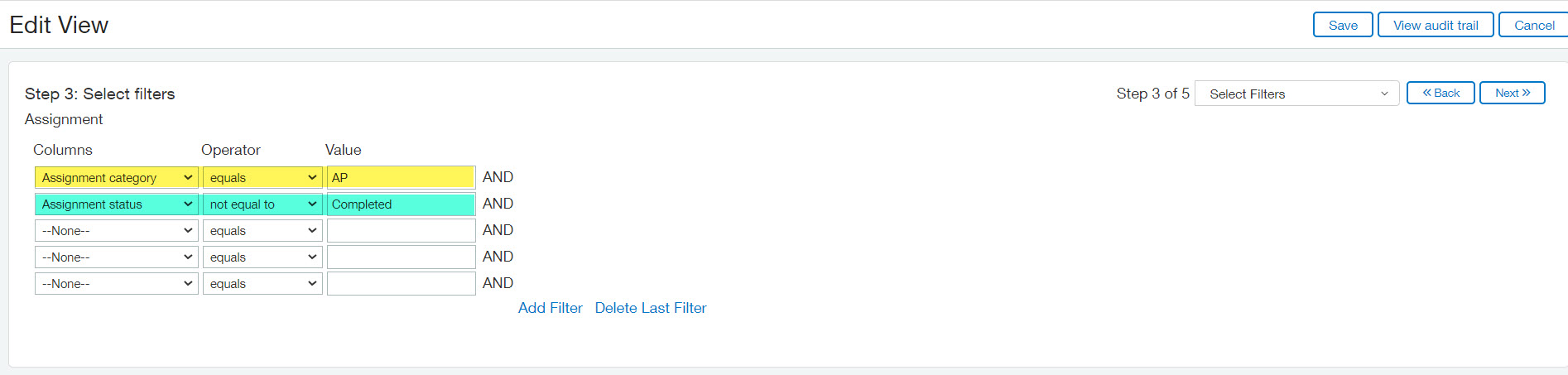 • Step 3: Filter for Assignment Category = AP and Assignment Status not equal to Completed