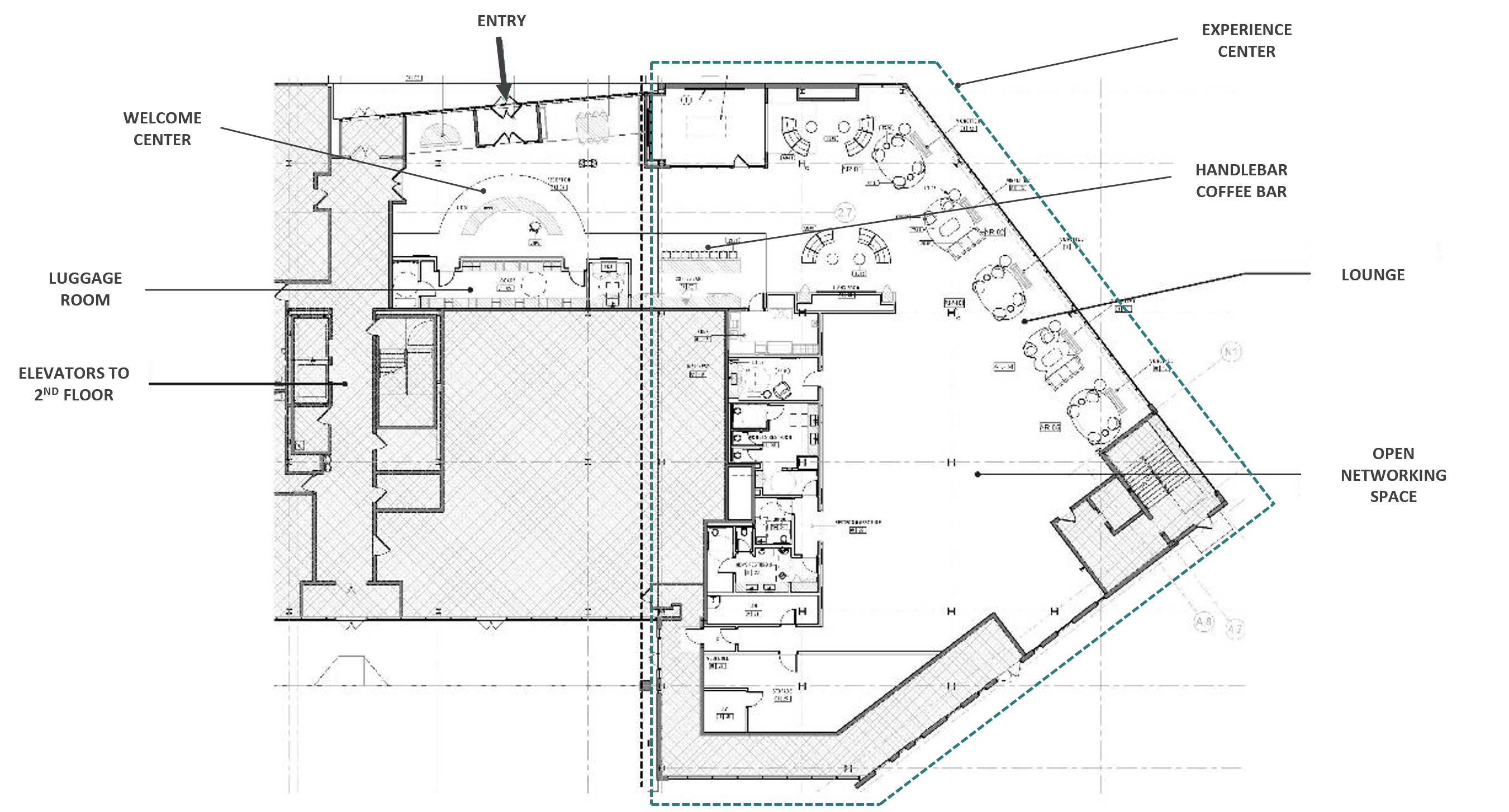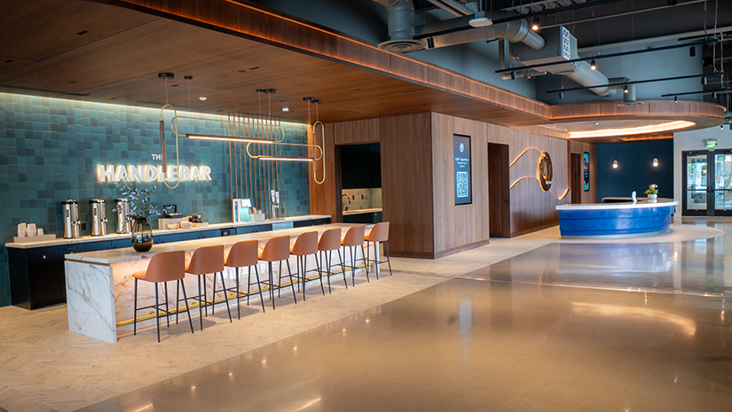 Handlebar coffee bar — A source of warm hospitality, the Handlebar in the first level offers networking essentials of coffee, tea and water. The wide range of beverage options, including Nitro and Cold Brew coffee on tap, will be sure your guests will find what they are looking for.