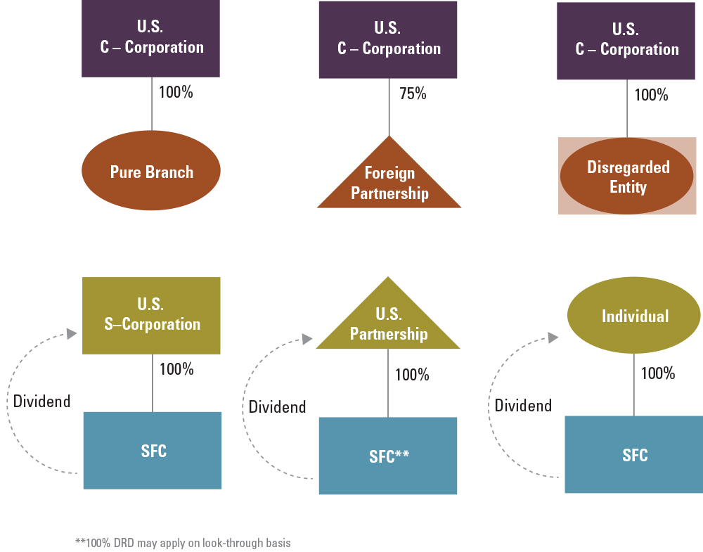 You must be a domestic C corporation and own at least 10 percent vote or value of the stock in the SFC paying the dividend in order to qualify for the 100 percent DRD. Be sure to review whether your SFCs generate Subpart F income or hybrid dividends, as this type of income is not eligible for the 100 percent DRD.