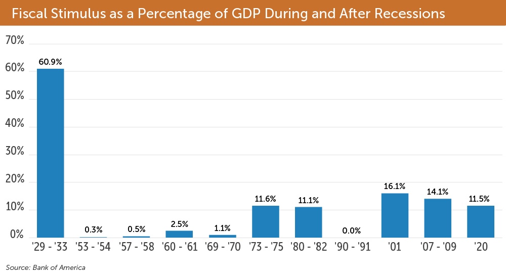 With respect to fiscal policy, the U.S. government remains willing and able to provide stimulus packages to counteract the fallout from COVID-19. While a stimulus of $2.4 trillion seems enormous in the context of dollars allocated to a government stimulus, the chart below demonstrates that these dollars, taken as a percent of GDP, make the current stimulus much more akin to the packages provided during the recessions of the mid-1970s and early 1980s. To date, Congress has enacted an economic stimulus approximating 11.5% of GDP, far below the stimulus during the Great Depression, and below the stimulus after 9/11 and during the Great Recession of the late 2000s.