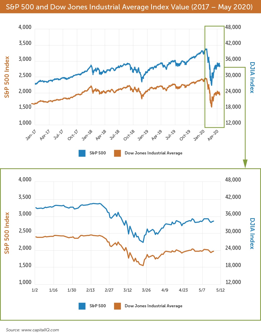 The Dow Jones Industrial Average (DJIA) has followed much of the same pattern as the S&P 500. On February 12, 2020, the DJIA peaked at a level of 29,551, and by March 23 the index had bottomed out at a level of 18,592 (a 37.1% decline). As of the close of trading on May 15, the index has climbed back to a level of 23,685, which is 27.4% higher than the March 23 low and 19.9% below the peak of February 12.
