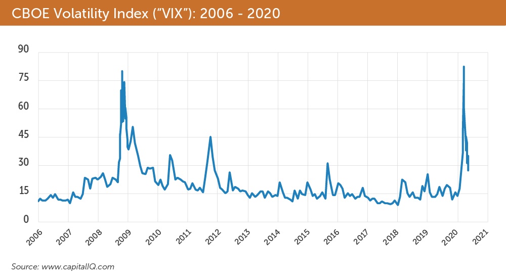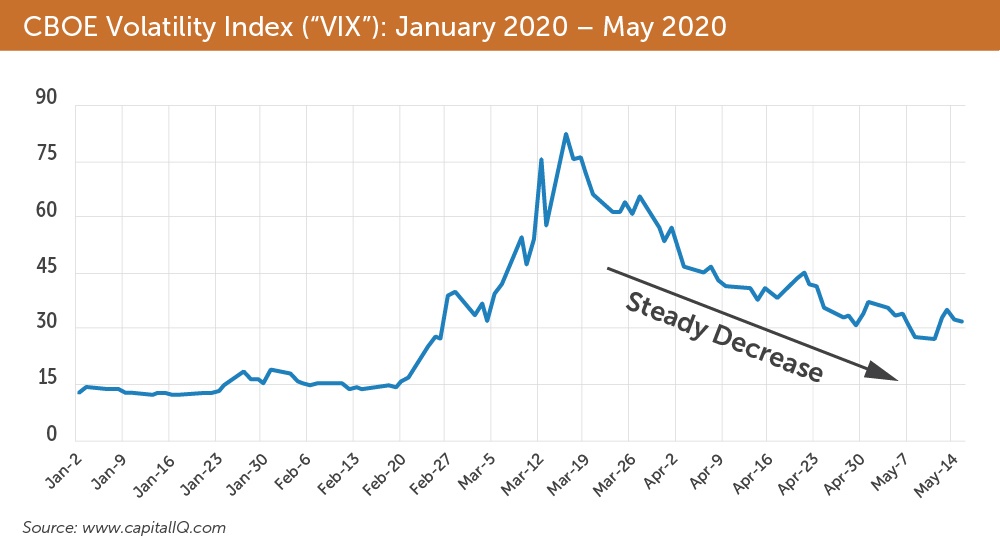 The CBOE Volatility Index (the “VIX”), a measure of market volatility, has also shown favorable trends. When the equity markets began to price in the economic impact from COVID-19, the VIX peaked at 82.69 on March 16, 2020. As of May 15, the index stood at 31.89, a decline of over 50 points. To put that in historical context, the VIX has averaged 16.42 since the beginning of 2015.