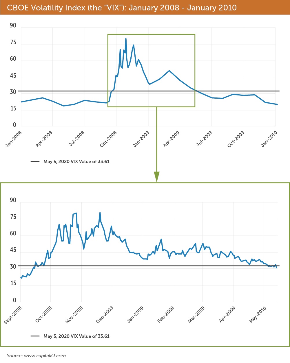 Furthermore, when you empirically examine the VIX and its movement during the Great Recession, market volatility was spread over a much longer extended period than it is currently. During the Great Recession, the VIX peaked at 80.86 on November 20, 2008, and did not return to May 15, 2020 levels of 31.89 until May 12, 2009 (173 days later).