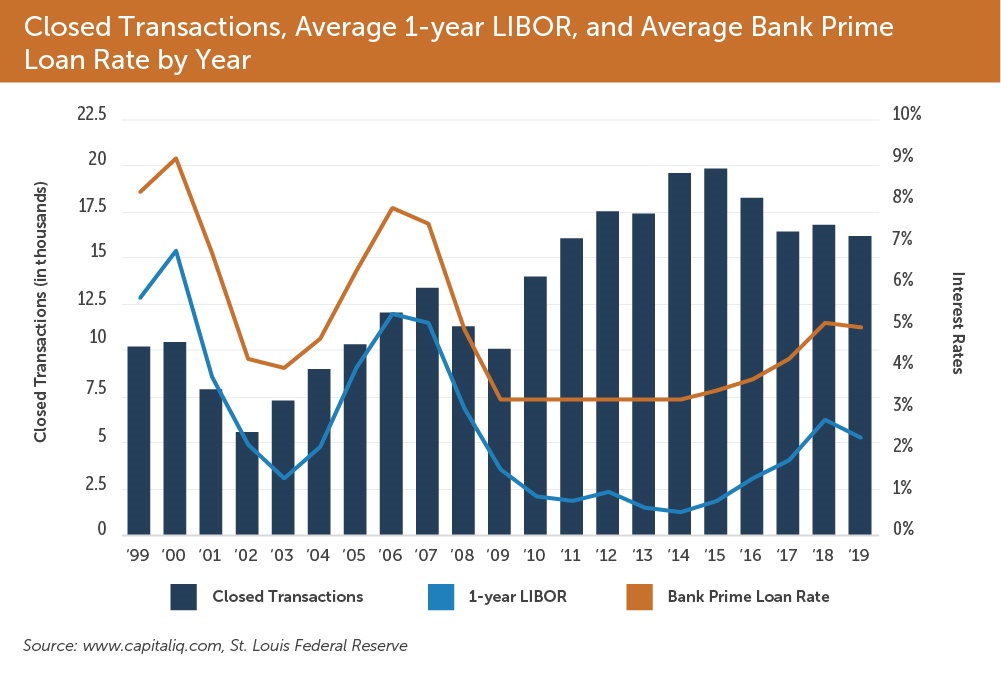 Furthermore, with the explosion in the number of private equity groups and the volume of transactions they perform, private equity has become a much more significant industry in the U.S. and, as a result, may weaken the strong correlation between M&A deals closed and interest rates. As shown in the chart below, consider the years 2004 and 2019, when one-year LIBOR averaged approximately 2.25%, and the bank prime loan rate averaged between 4.75% and 5.0% (Source: www.capitaliq.com, St. Louis Federal Reserve).
