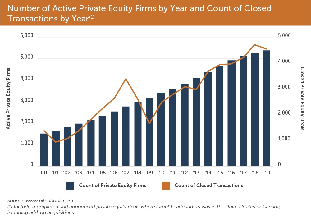 (2) Private equity funds continue to grow in both number and capital overhang. Private equity funds now have an estimated $1.5 trillion in overhang compared to just over $500 billion only 10 years prior (Source: cnbc.com, Rooney, K. [2020, January 3]. Private equity’s record $1.5 trillion cash pile comes with a new set of challenges). These funds are meant to deploy their capital quickly in hopes of earning a great return, which then allows the private equity fund’s general partners to raise more funds for future investments. The availability of private equity funds that are yet to be deployed cannot be overlooked, especially as interest rates remain historically low.