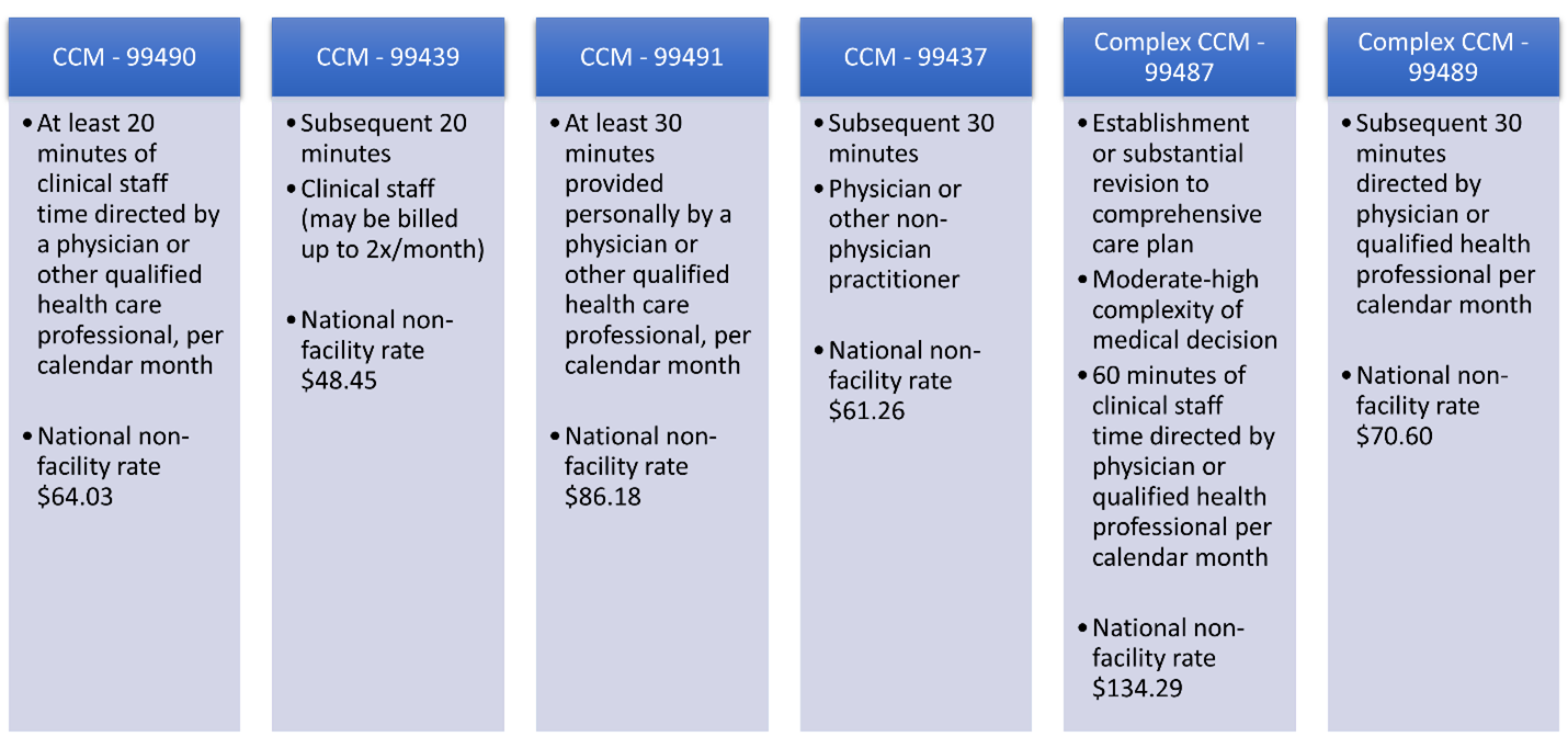 CMS began reimbursing CCM codes back in 2015 and has regularly improved those codes, including under the 2022 final PFS rule. CCM requires an individual to have two or more chronic conditions that are expected to last for at least 12 months or cause death. If not addressed, the individual is at significant risk of death, acute exacerbation or decompensation, or functional decline. A comprehensive care plan must be established, implemented, revised, and monitored.