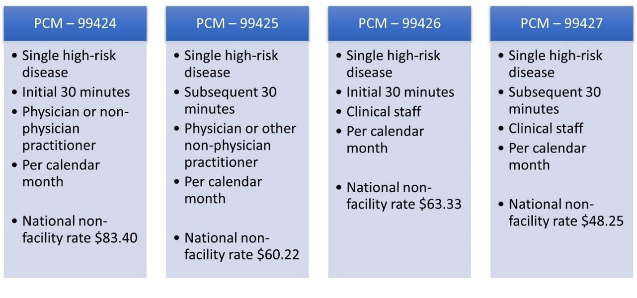 Under PCM, there are four codes available: two base codes depending on provider or clinical staff plus respective add-on codes for additional time spent. CMS also increased reimbursement for several PCM codes this year.