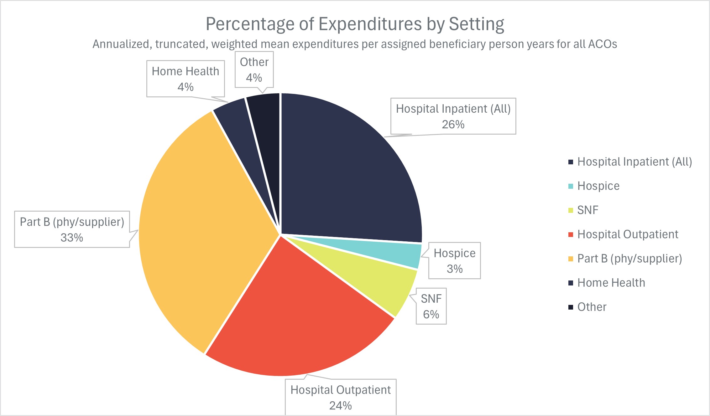 When breaking these expenditures down by setting, the largest expenditures by percentage of total (33%) were in the Part B setting (physician and suppliers). When you add another 24% from the outpatient setting of hospital outpatient, rural health clinics, federally qualified health centers, dialysis, and others, it totals 57% in various outpatient/clinic settings. Since ACOs are generally designed to focus on primary care, this percentage makes sense.