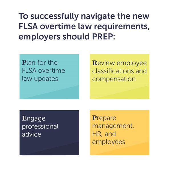 - Educating your management, human resources team, and employees on FLSA law changes and any necessary adjustments can facilitate a smooth transition.