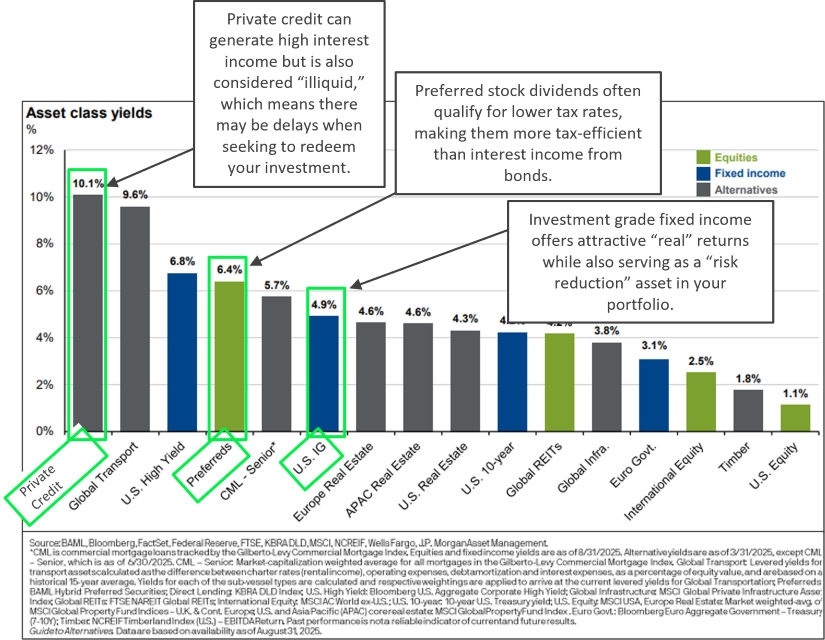 When seeking income, the most attractive sectors include private credit, preferred stocks, and investment grade bonds.