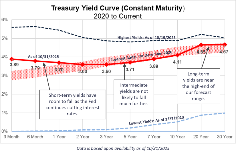 Short-term rates have room to fall. Intermediate rates are near the low-end of our range while long-term rates are near the high end.