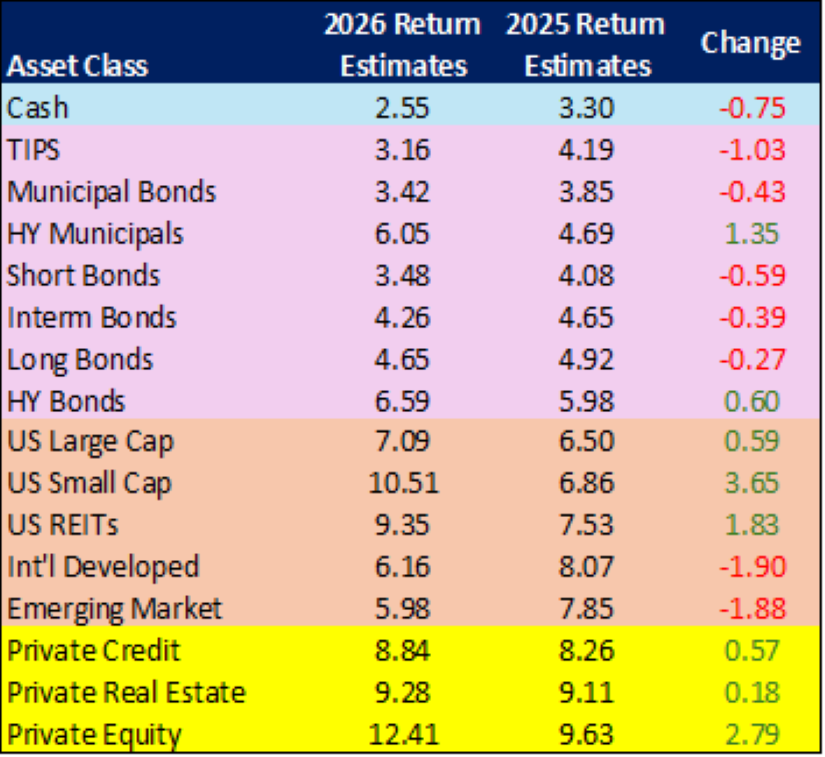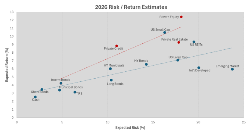 Capital market assumptions help guide strategic portfolio decisions. For 2026, models may favor private equity, private credit, and small-cap stocks for their strong risk-adjusted return potential. Real estate and select income-generating assets also rank well.