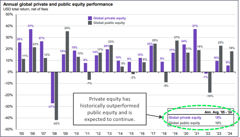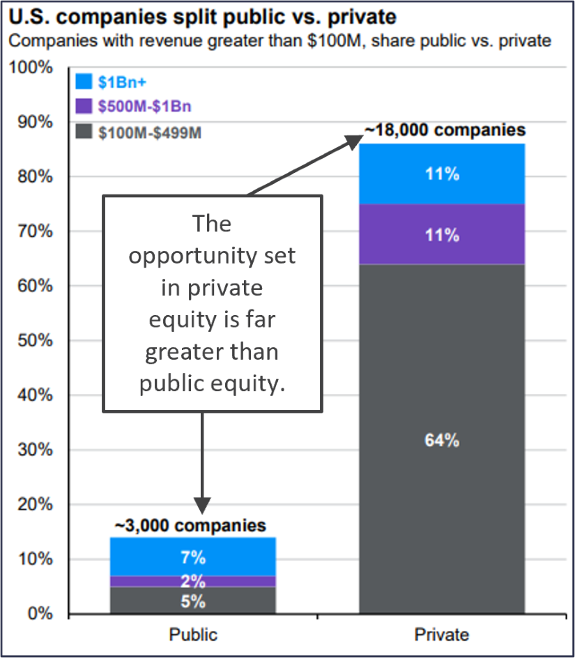 There are approximately 18,000 companies in the private sector while there are only about 3,000 companies in the public sector. Private equity has a strong history of outperforming public equities over the long run.