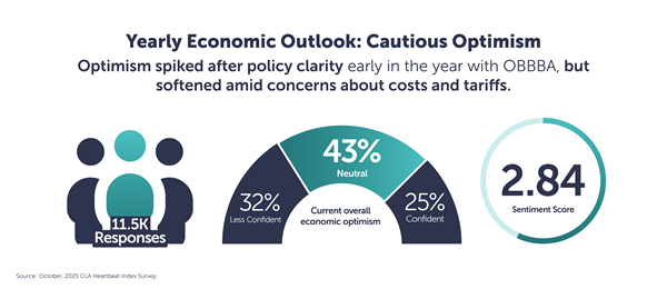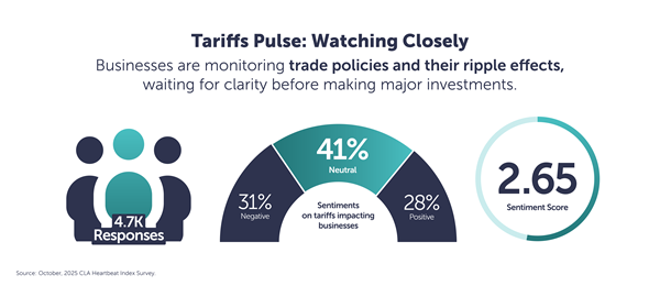 The Heartbeat Index reflects the voices of small, mid-sized, and large organizations across diverse sectors, including construction, real estate, state and local government, nonprofits, health care, private equity, and more. Each month since March, CLA has asked clients and other business leaders about their outlook on the economy, hiring, expansion, and the impact of tariffs and policy changes.