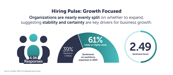 Today, CLA (CliftonLarsonAllen LLP) announced the release of its initial Heartbeat Index, an exploratory snapshot of business sentiment gathered from thousands of clients and other business leaders since March 2025.