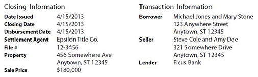 The General Information section located at the top of page 1 of the CD includes closing information, transaction information, and loan information. Incorrect completion or the omission of the issue date of the CD, the settlement agent name, or the seller’s address for a purchase transaction are the most common oversights in this section.