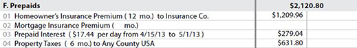 Section F. Prepaids includes those items that are required by the lender to be paid in advance, such as homeowner’s insurance premiums or property taxes. These prepaid items must show the period of time covered by the amount collected.