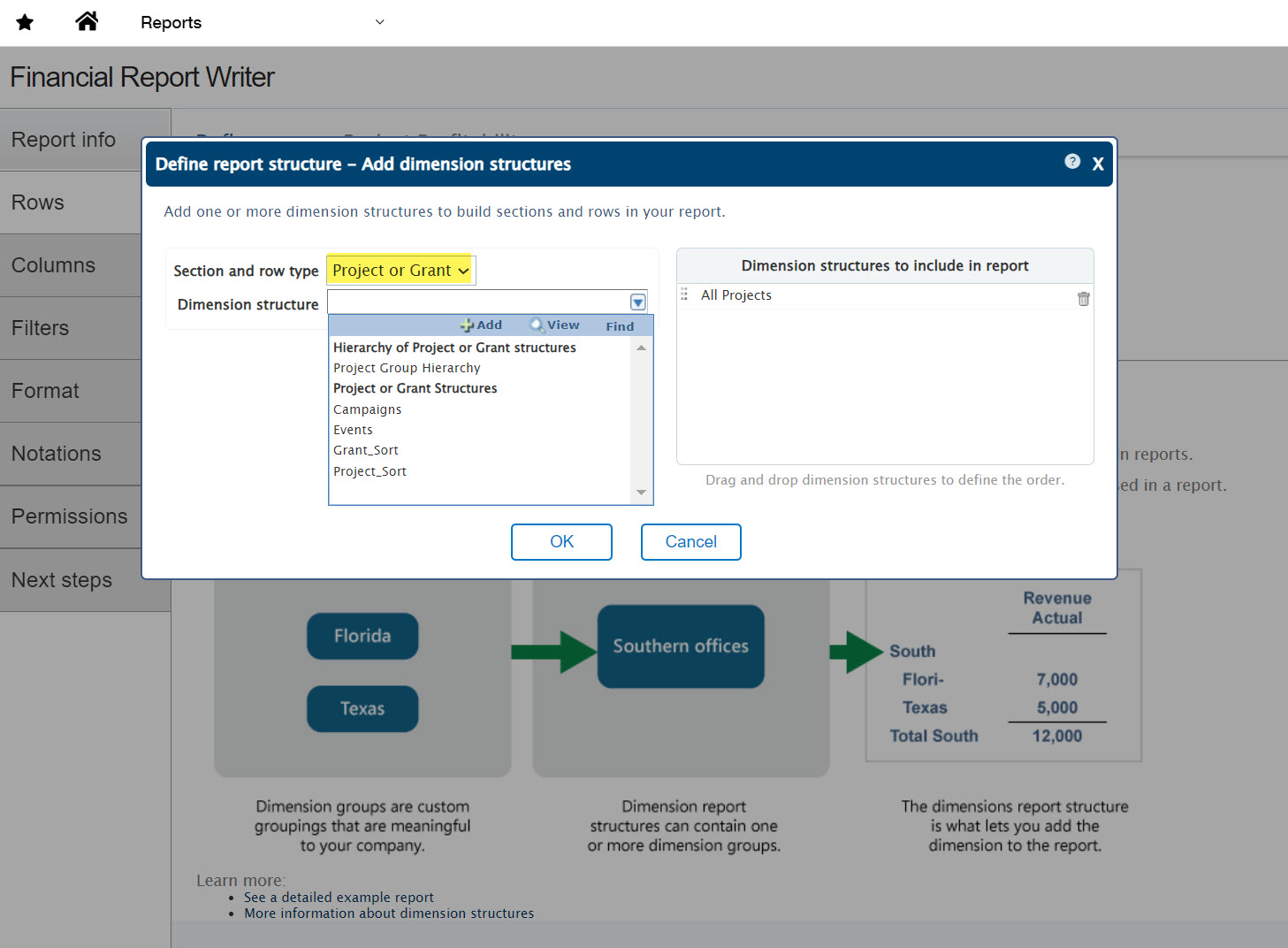 - Report structure – what will appear in the rows of the report. Either Accounts or Dimensions. In our example we’ll choose Dimensions. What’s the difference? The accounts option is typically used when account groups and accounts are displayed in rows – think Balance Sheet, Income Statement, Cash Flow. The dimensions option is used when displaying dimensions, like project, in rows and account groups on columns.