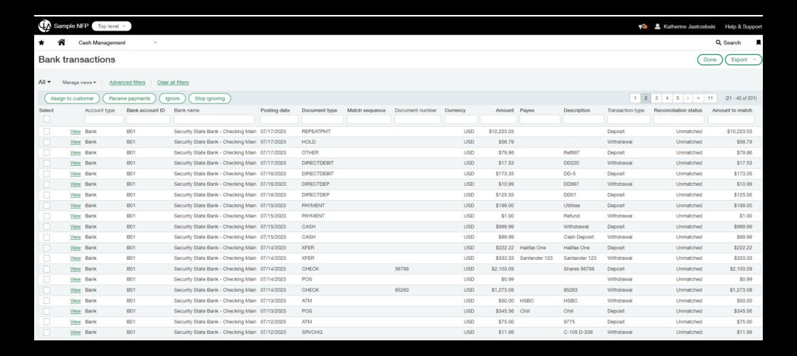 With each of these options, as bank transactions occur, they are directly fed into Sage Intacct’s Bank Transaction record list view.