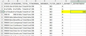 - Notice that anything with a "T" in any of the "F_" columns has a filter and the filter is identified on the column to the right. (Ex: The below report is filtered on department 100).