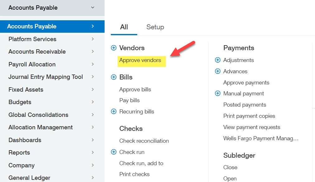 - Go to Accounts Payable > All tab > Approve vendors.