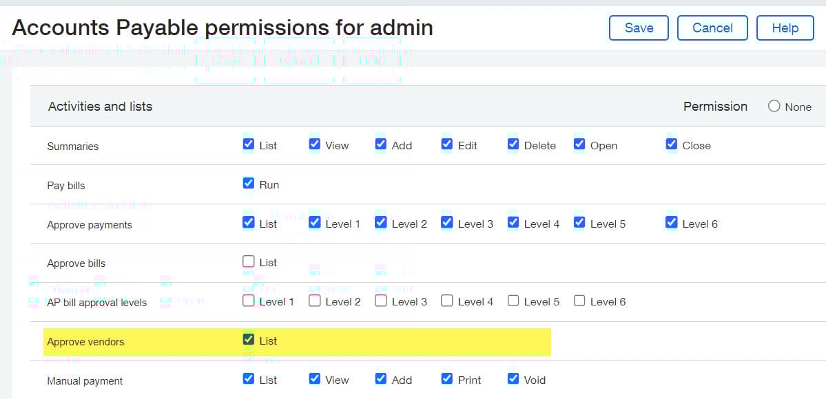 - To approve vendors, you will need to have the “list” permission for Approve Vendors.