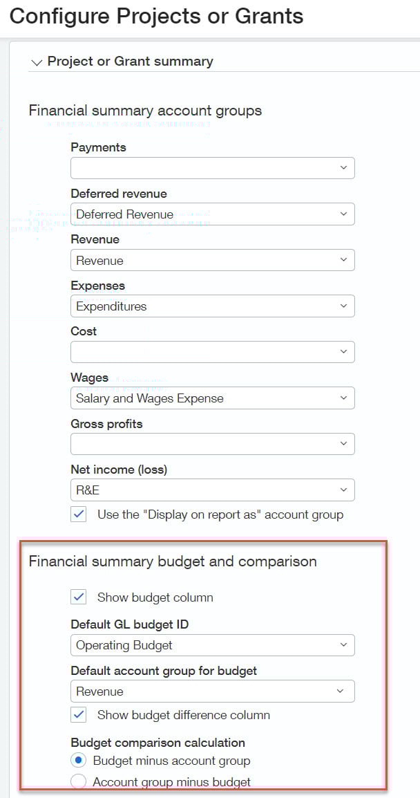 - Budget comparison calculation – choose how you would like to display the difference between budget and actual: budget minus account group or account group minus budget.