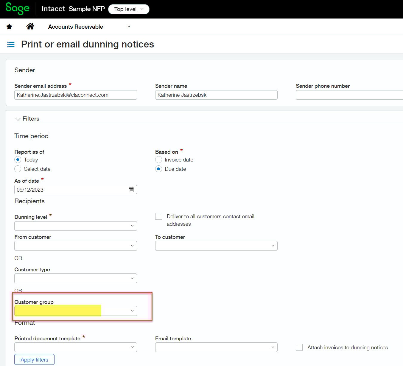 If you have taken advantage of Intacct’s new dunning notice feature, you may have thought “this is so easy to use and really great, but how do we filter out those customers that we really would rather exclude from dunning notices?” With the latest release you can do just that! Run dunning notices for a customer group that excludes those few customers that you’d rather not disturb.