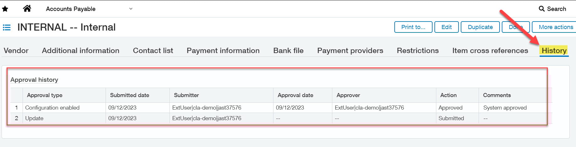- The person who turns on approvals will show on the History tab as the person who initially approved all vendors
