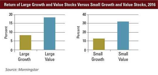 2016 was a year of trend reversal with regard to the returns of U.S. stocks as defined by size and relative price (value versus growth stocks). Small cap stocks (Russell 2000) outperformed large caps (S&P 500) by more than 9 percent, the largest small cap outperformance since 2010.